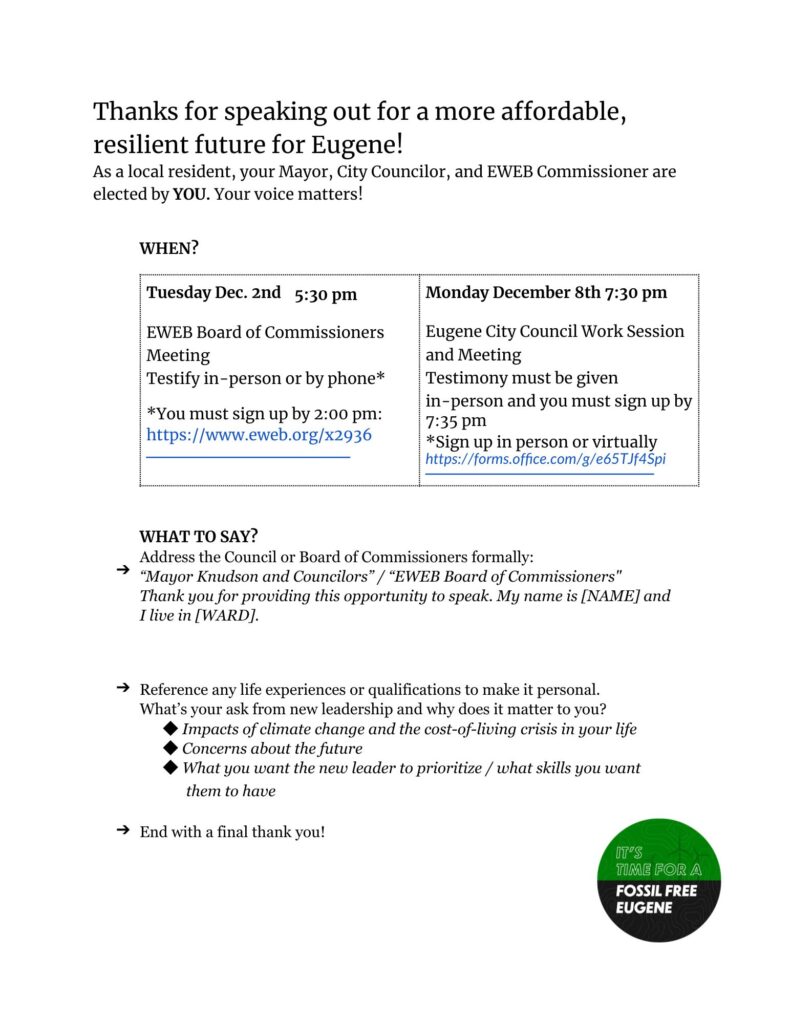 - Give public comment at the EWEB Board of Commissioners Public Meeting on December 2nd.